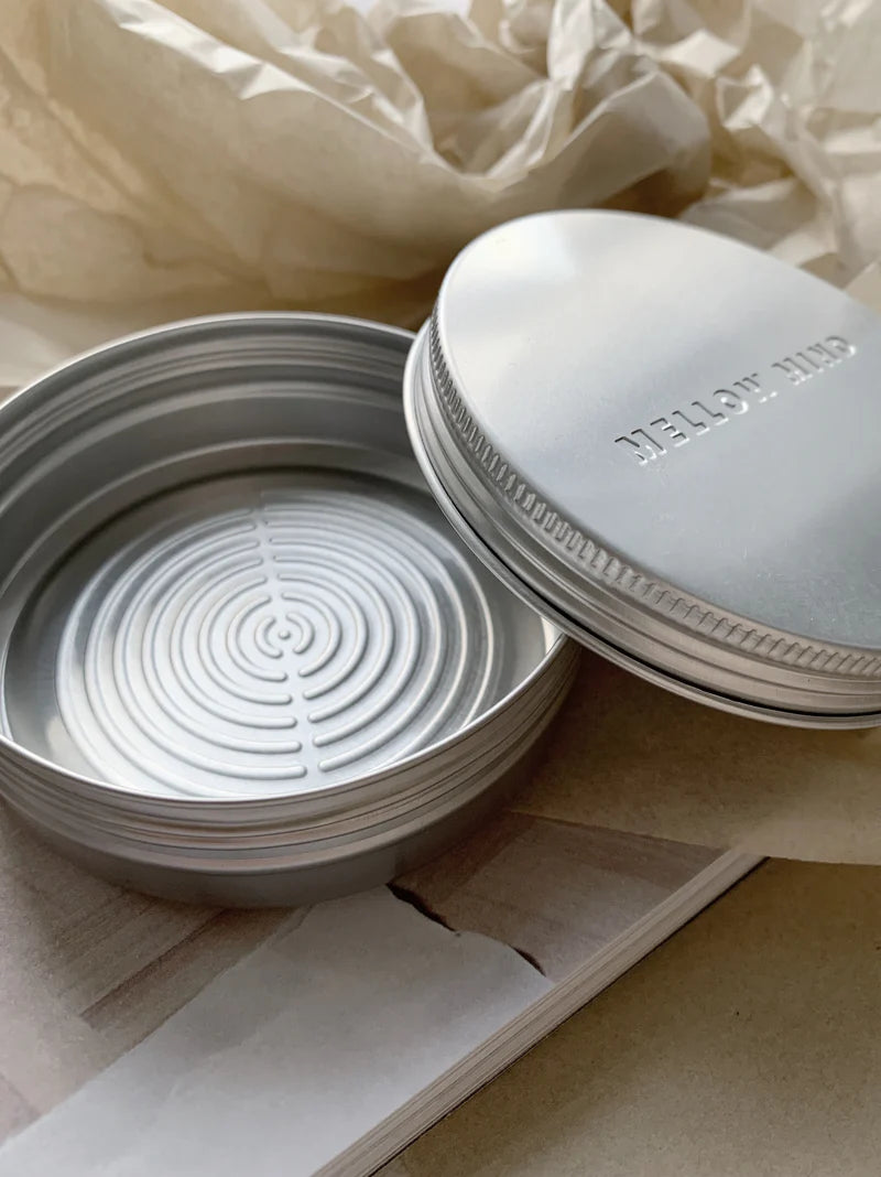 Mellow Minds Rejsebeholderer en minimalistisk og praktisk rejsebeholder designet til opbevaring af Mellow Minds shampoo og conditioner bars. Beholderen er lavet i aluminium og har et præget logo i låget samt et halvcirkelformet aftryk i bunden. Dette design sikrer, at produktet kan tørre hurtigere i beholderen og forhindrer, at shampoo- eller conditionerbaren sætter sig fast i bunden.